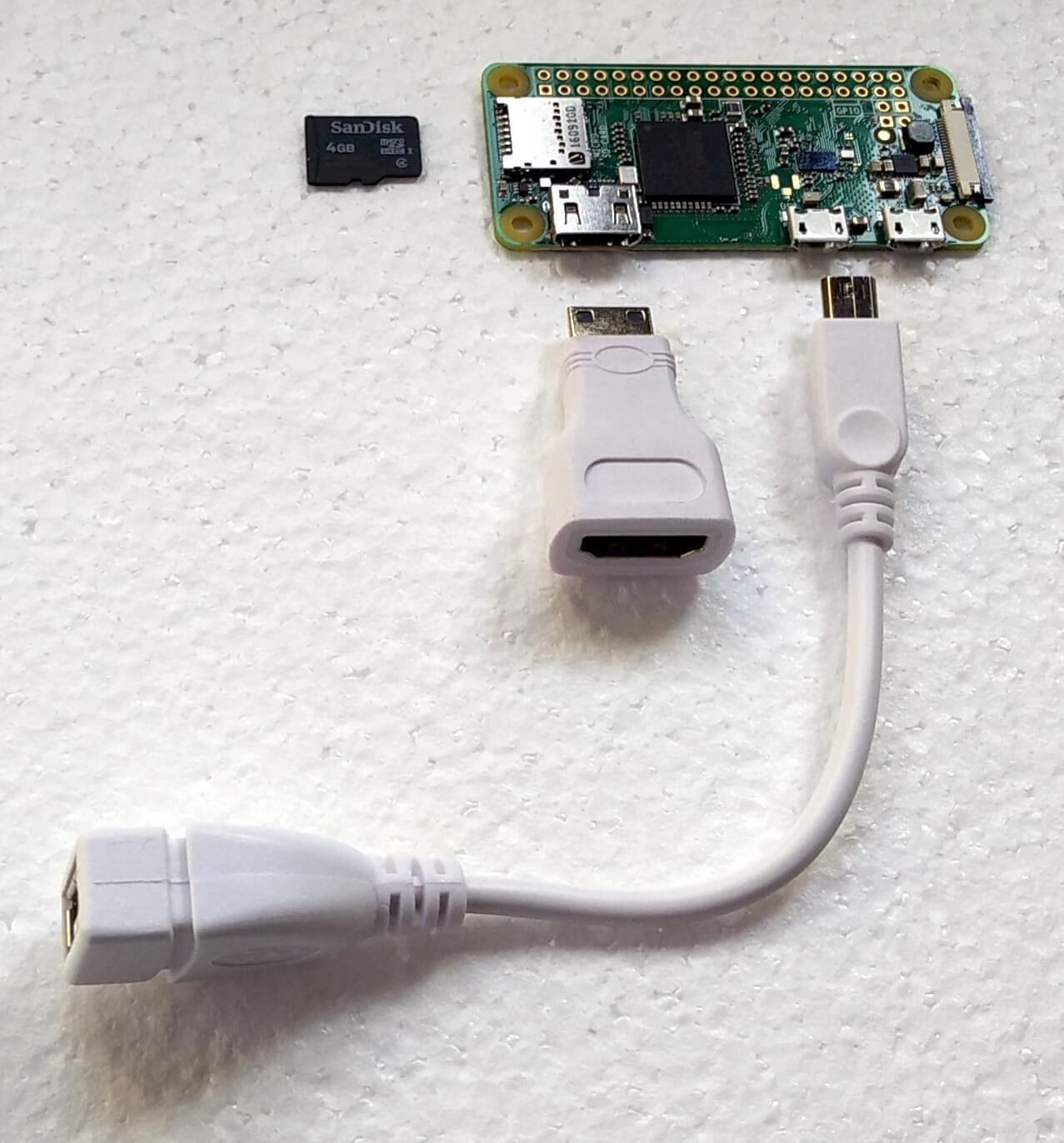 Il Kit Pi Zero W Budget, oggetto di questa recensione, viene consegnato in una scatola di cartone comune. All’ interno, tra le “patatine” di materiale espanso di imballaggio, troviamo i singoli componenti del kit ognuno racchiuso in un piccolo sacchetto plastico (antistatico nel caso del Raspberry Pi): un adattatore da mini-HDMI a HDMI, un adattatore da micro-USB a USB On-The-Go, Scheda micro-SD 4GB SanDisk, e naturalmente Raspberry Pi Zero W. E’ presente anche un connettore 2×20 pin da saldare sui pin del GPIO, non presente in fotografia.