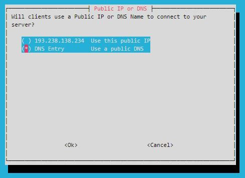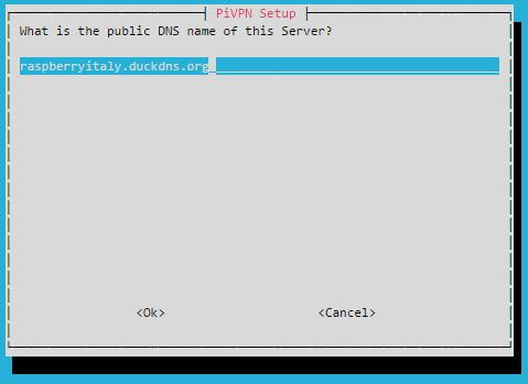 Dopo il caffè, si configurano l’ip pubblico, se hai un ip Pubblico statico seleziona la prima scelta, se invece è dinamico, puoi creare cinque nomi DDNS gratuiti con DuckDns.org, sceglierne uno e scrivilo nella voce dns entry .